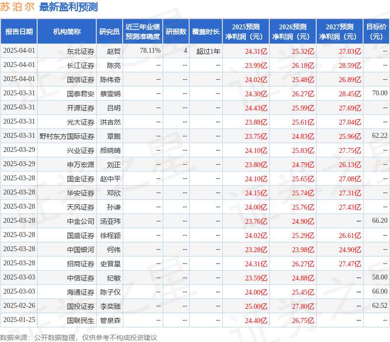 最新盈利预测明细如下: