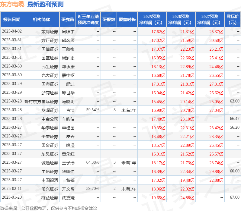 财信证券股份有限公司袁玮志近期对东方电缆进行研究并发布了研究报告《在手订单创新高,看好海风放量》,下调东方电缆目标价至60.0元,给予买入评级。