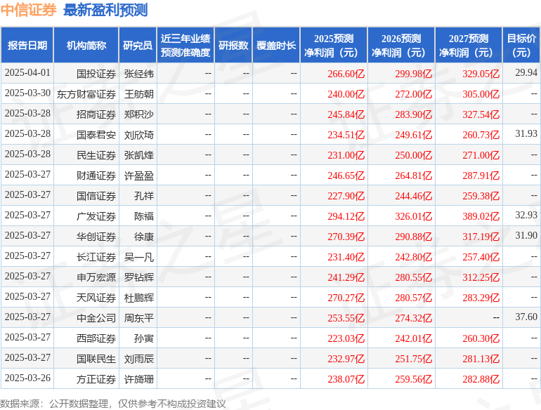 中原证券股份有限公司张洋近期对中信证券进行研究并发布了研究报告《2024年年报点评:投资收益连续增长,境外业务经营稳健》,给予中信证券增持评级。