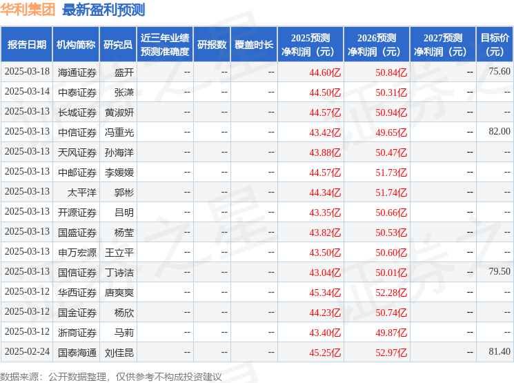 最新盈利预测明细如下: