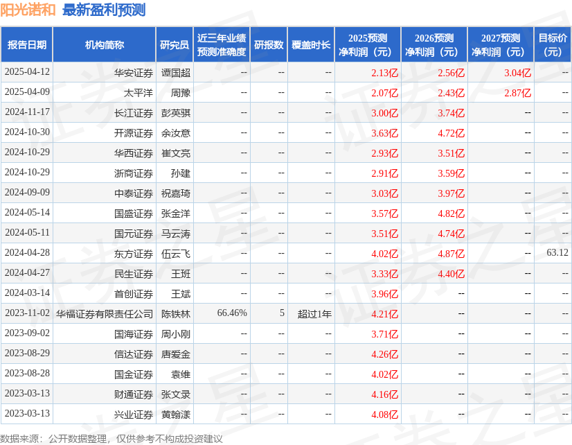 最新盈利预测明细如下: