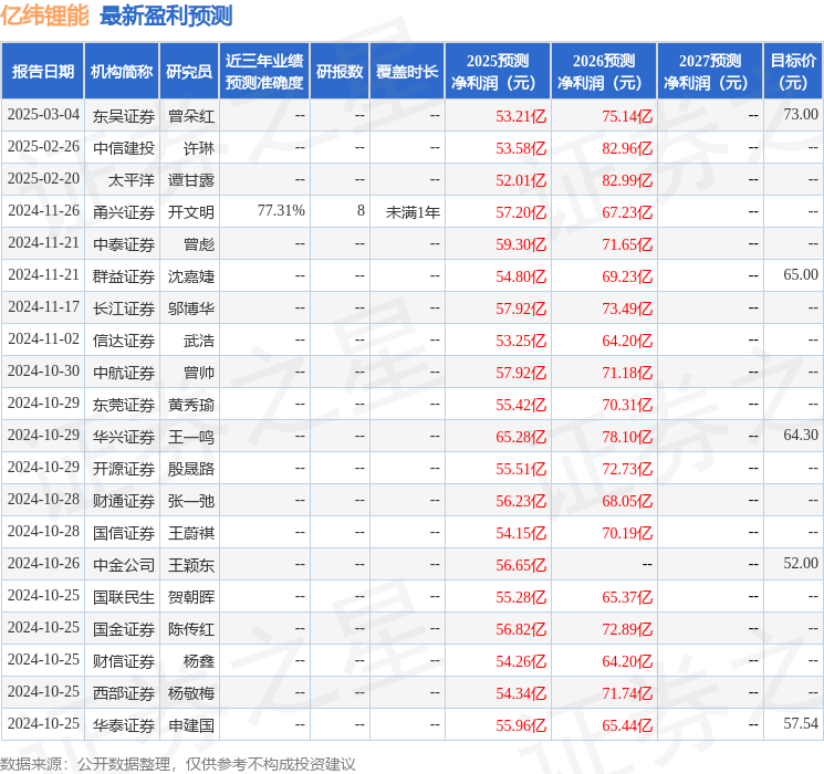 最新盈利预测明细如下: