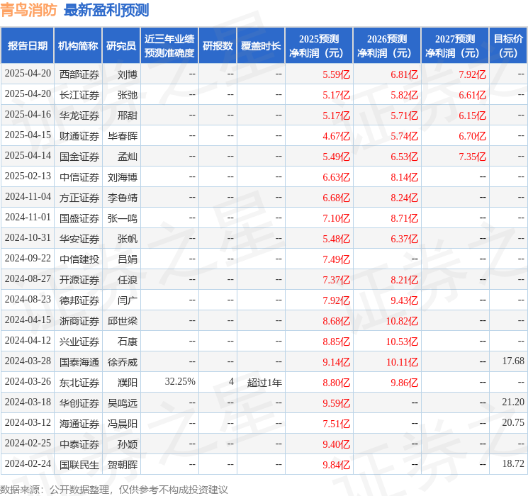 最新盈利预测明细如下: