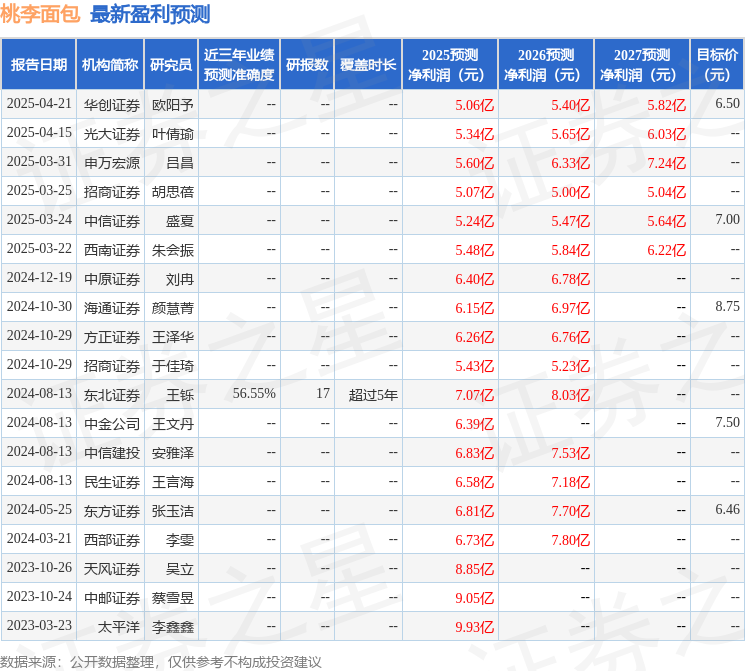 西南证券股份有限公司朱会振,舒尚立近期对桃李面包进行研究并发布了研究报告《2025年一季报点评:25Q1仍有承压,静待后续调整改善》,给予桃李面包增持评级。
