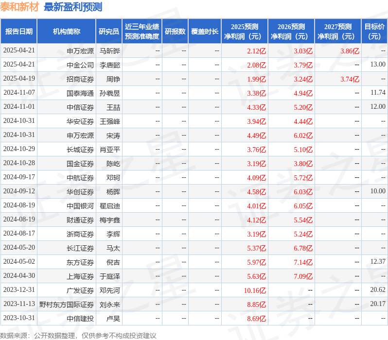 最新盈利预测明细如下: