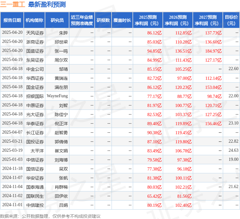最新盈利预测明细如下: