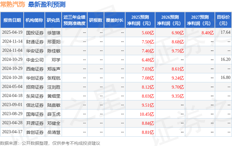 最新盈利预测明细如下: