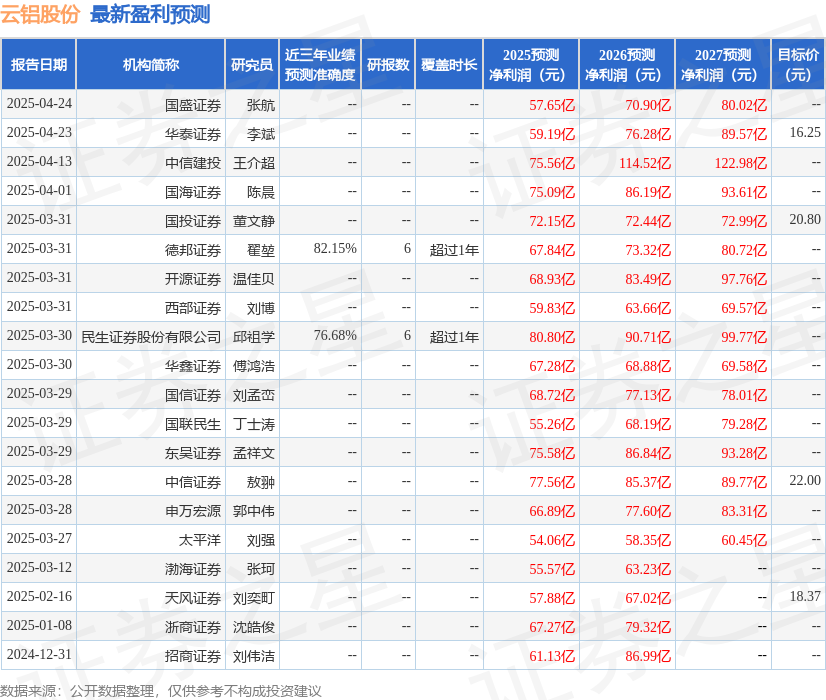 华安证券股份有限公司许勇其,黄玺近期对云铝股份进行研究并发布了研究报告《25Q1业绩符合预期,利润有望进一步修复》,给予云铝股份买入评级。