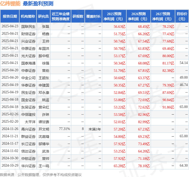 最新盈利预测明细如下: