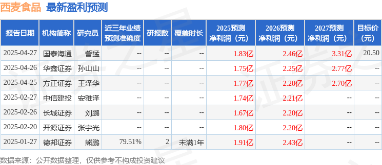 西麦食品2024年营收19.0亿元,同比+20.2%,归母净利润1.3亿元,同比+15.4%,扣非净利润1.1亿元,同比+16.8%。2XM外汇官网025Q1营收6.6亿元,同比+15.9%,归母净利润0.5亿元,同比+21.2%,扣非净利润0.5亿元,同比+27.7%。收入业绩符合预期,我们维持2025-2026年盈利预测,并新增2027年盈利XM外汇官网预测,预计2025-2027年归母净利润分别为1.8亿元、2.2亿元、2.6亿元,同比分别+35.4%、+24.1%、+18.2%,EPS分别为0.81元、1.00元、1.18元,当前股价对应PE分别XM外汇官网为23.0、18.6、15.7倍,受益于产品、渠道双扩张,公司全年收入增长确定性较好,后续随着成本红利凸显,利润弹性较大,维持“增持”评级。