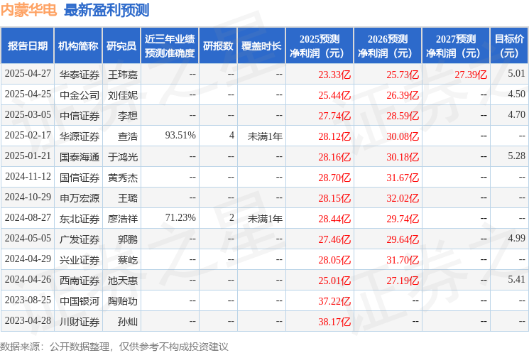 华源证券股份有限公司刘晓宁,查浩,蔡思近期对内蒙华电进行研究并发布了研究报告《25Q1业绩低于预期,煤电一体化奠定盈利稳定性》,给予内蒙华电买入评级。
