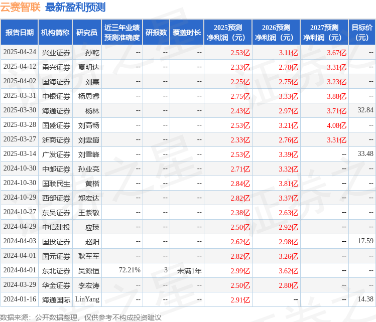 东吴证券股份有限公司王紫敬,王世杰近期对云赛智联进行研究并发布了研究报告《2024年年报和2025年一季报点评:上海算力建设风来,算力领军云赛启航》,给予云赛智联买入评级。