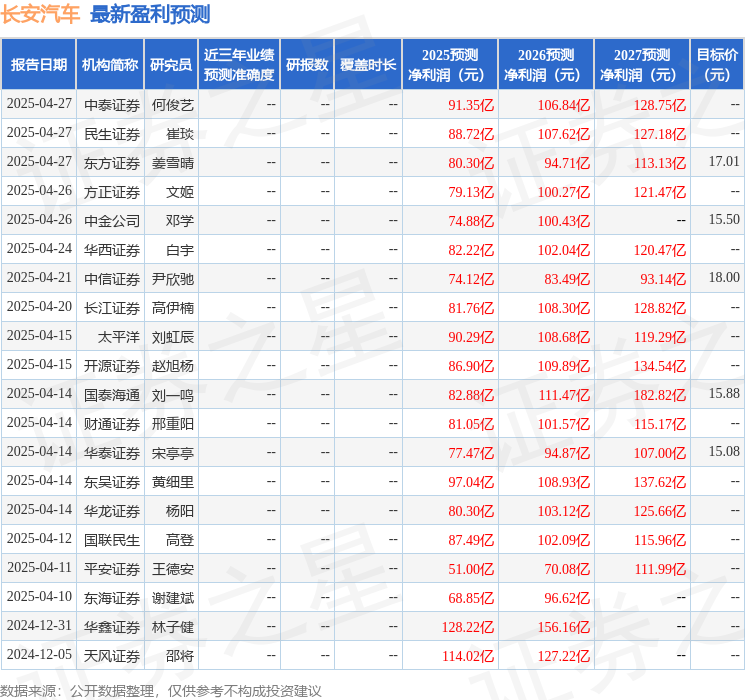 东吴证券股份有限公司黄细里,孟璐近期对长安汽车进行研究并发布了研究报告《2025年一季报点评:业绩符合预期,三大计划齐头并进》,给予长安汽车买入评级。