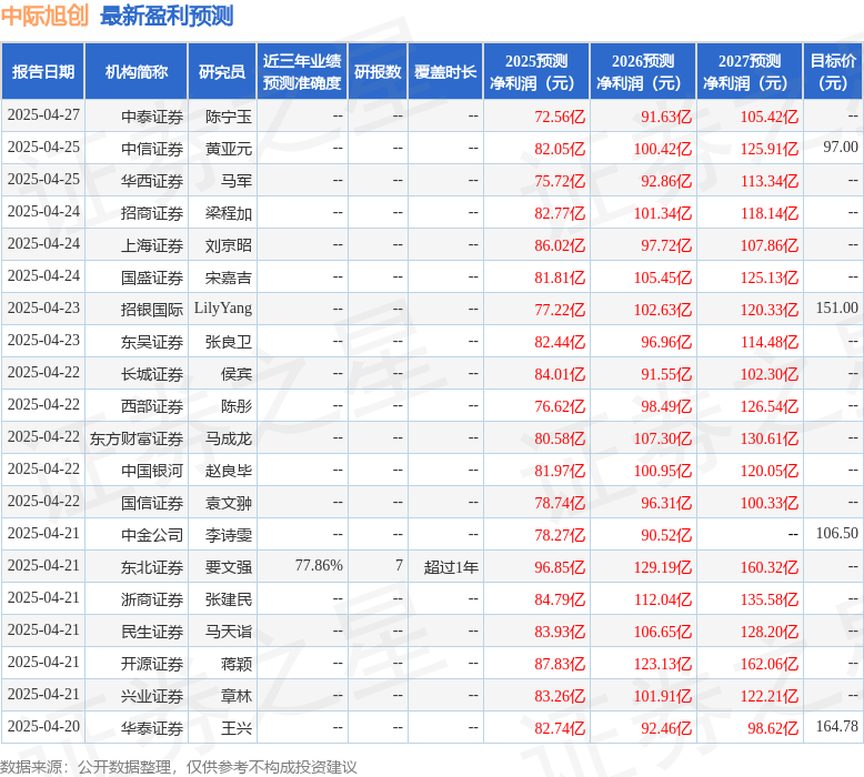 最新盈利预测明细如下: