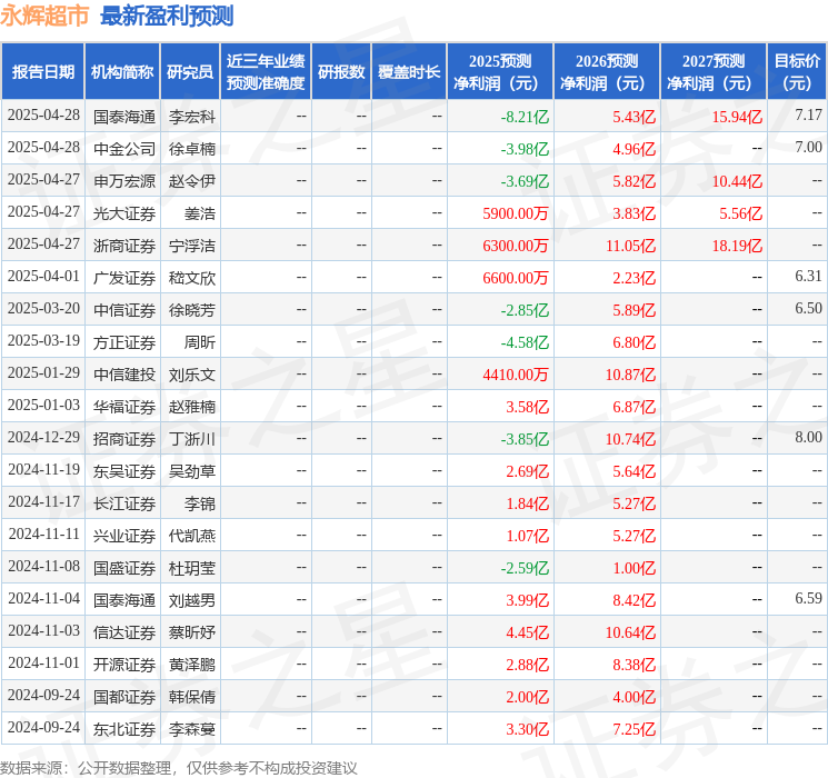 东吴证券股份有限公司吴劲草,阳靖近期对永辉超市进行研究并发布了研究报告《2024年年报及2025年一季报点评:经营趋势向好,供应链改造及关店影响短期利润》,给予永辉超市增持评级。