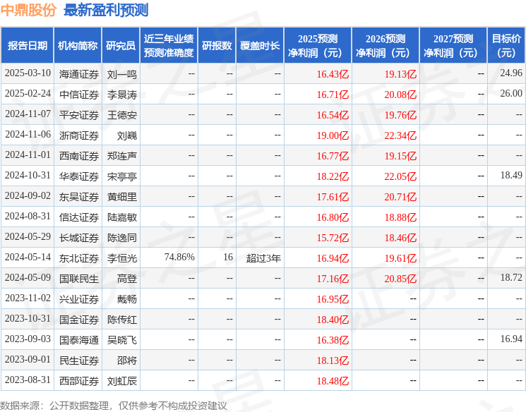 最新盈利预测明细如下: