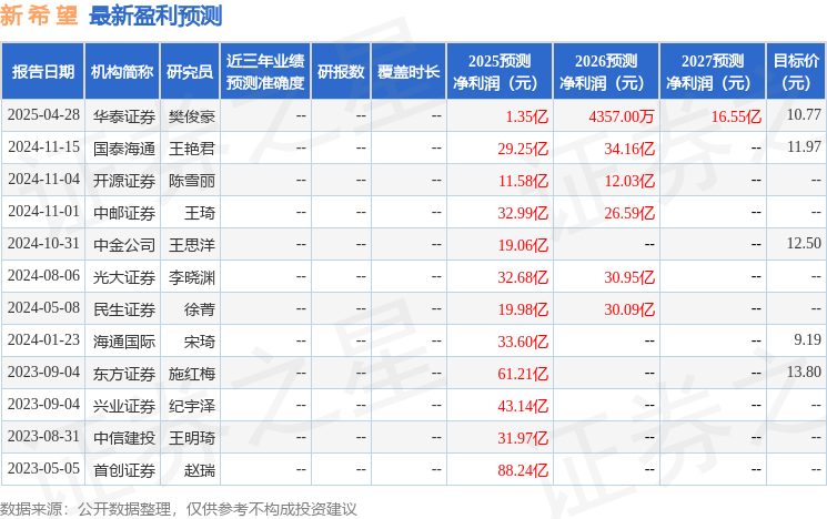 开源证券股份有限公司陈雪丽,朱本伦近期对新希望进行研究并发布了研究报告《公司信息更新报告:生猪养殖逐步优化,海外饲料拓展顺利》,给予新希望买入评级。