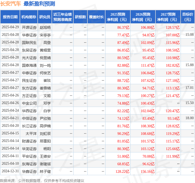 国元证券股份有限公司刘乐,陈烨尧近期对长安汽车进行研究并发布了研究报告《公司点评报告:电动智能化齐头并进,海外布局加速》,下调长安汽车目标价至15.41元,给予买入评级。