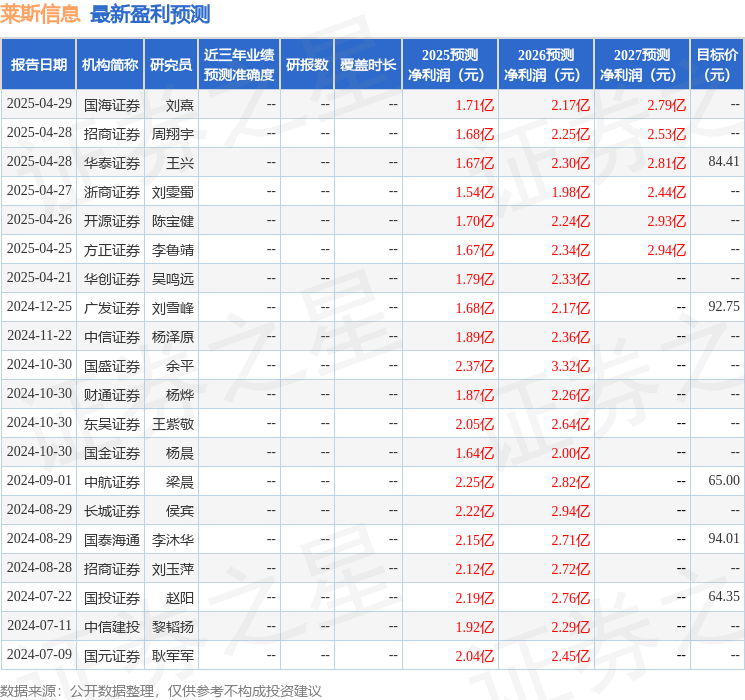 国元证券股份有限公司耿军军,王朗近期对莱斯信息进行研究并发布了研究报告《2024年年报及2025年一季报点评:积极布局低空经济,持续加大研发投入》,给予莱斯信息增持评级。