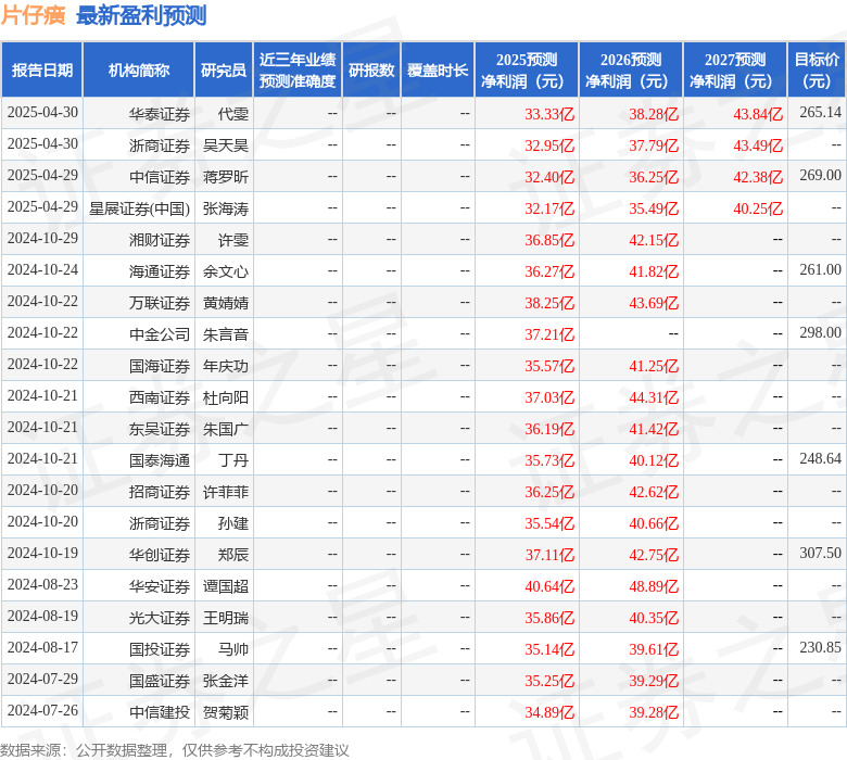 盈利预测与投资建议:公司核心产品片XM外汇官网仔癀具备稀缺性。根据公司公告披露,我们调整公司盈利预测,预计2025/2026/2027年归母净利润分别为32.80亿元/38.07亿元/42.48亿元(前预测值为38.25亿元/43.69亿元/-)XM外汇官网,对应EPS5.44元/股、6.31元/股、7.04元/股,对应PE为37.77/32.54/29.16(对应2025年4月30日收盘价205.33元),维持“买入”评级。