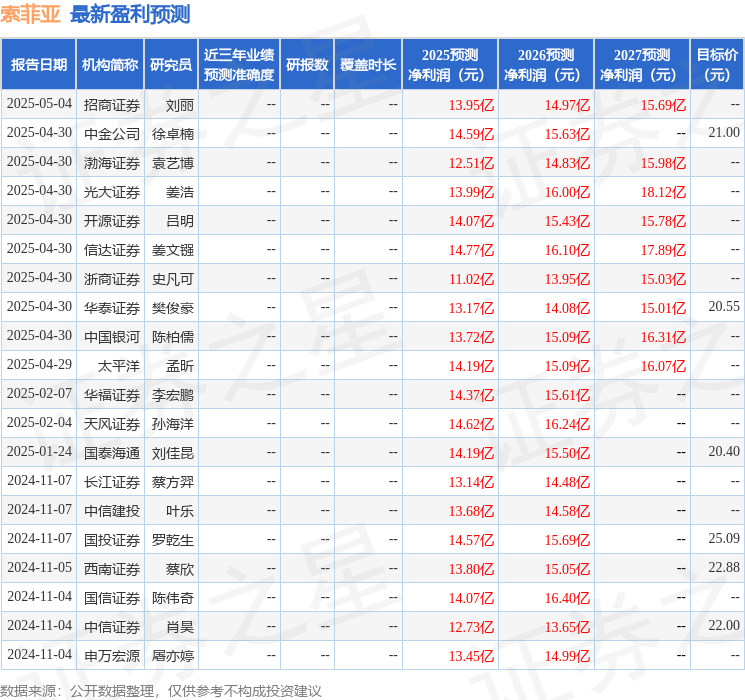 最新盈利预测明细如下: