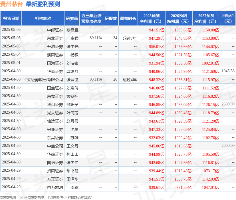群益证券(香港)有限公司顾向君近期对贵州茅台进行研究并发布了研究报告《2025Q1业绩稳健,优化考核激发经销商积极性》,给予贵州茅台持有评级,目标价1674.0元。