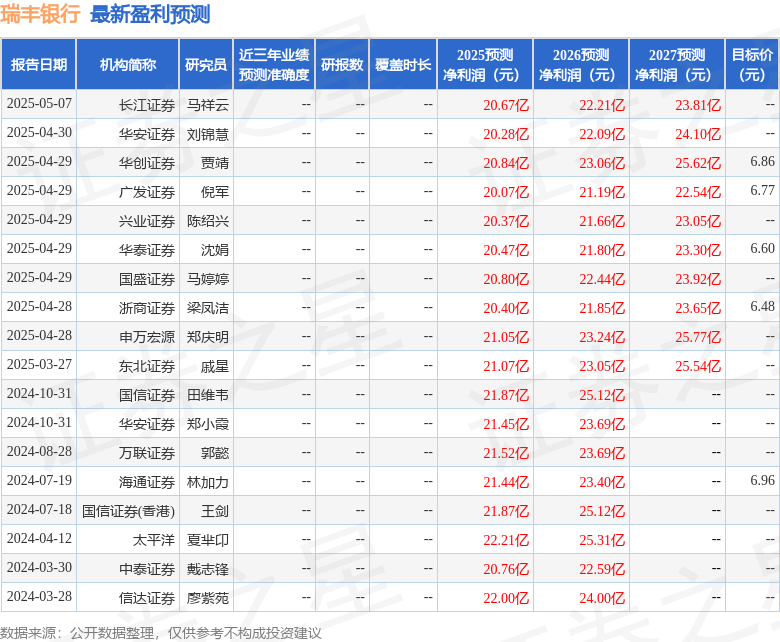 中国银河证券股份有限公司张一纬,袁世麟近期对瑞丰银行进行研究并发布了研究报告《瑞丰银行2024年年报与2025年一季报业绩点评:存款成本优化,中收保持高增》,首次覆盖瑞丰银行给予买入评级。