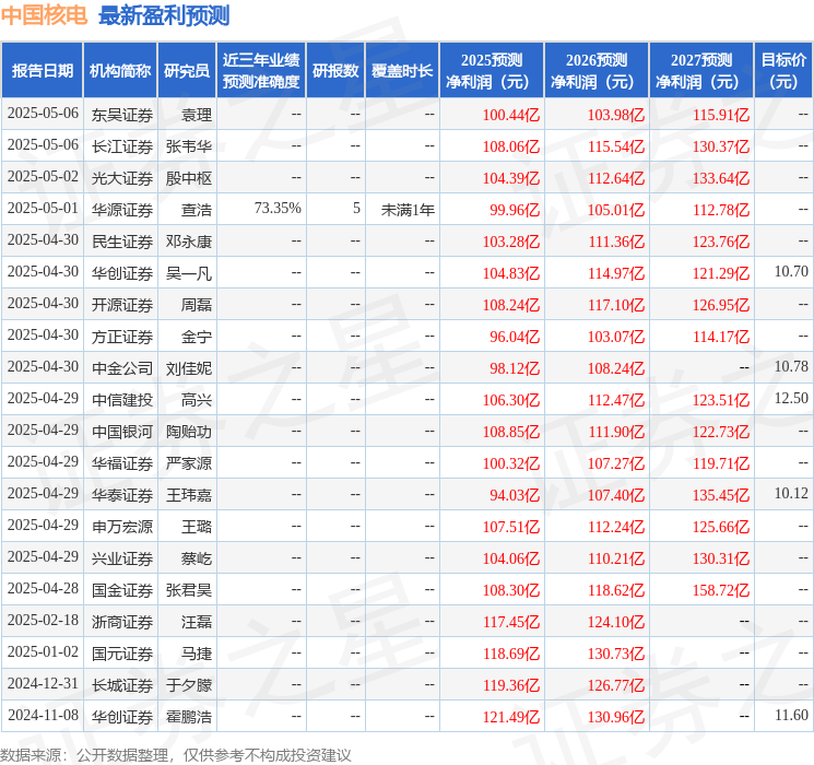 中原证券股份有限公司陈拓近期对中国核电进行研究并发布了研究报告《年报点评:所得税费用增加短期承压,新机组投产驱动核电业务长期增长》,给予中国核电增持评级。