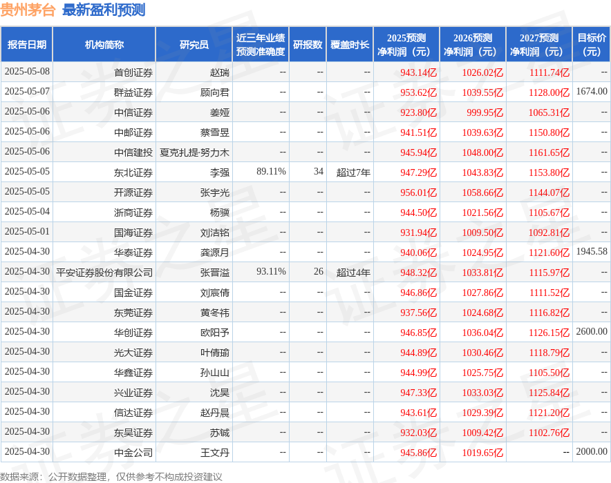 天风证券股份有限公司张潇倩近期对贵州茅台进行研究并发布了研究报告《25Q1业绩表现亮眼,预计全年稳健向前》,给予贵州茅台买入评级。