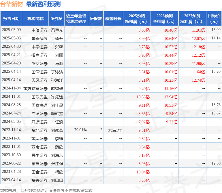 最新盈利预测明细如下: