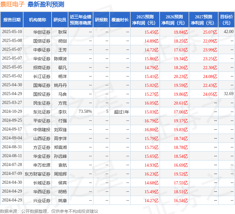 西南证券股份有限公司王谋,白加一近期对景旺电子进行研究并发布了研究报告《2025年一季报点评:看好PCB全平台工艺能力下客户突破机会》,上调景旺电子目标价至34.32元,给予买入评级。