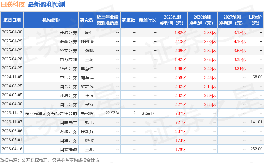 最新盈利预测明细如下: