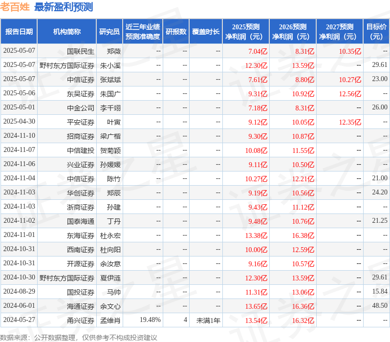 最新盈利预测明细如下: