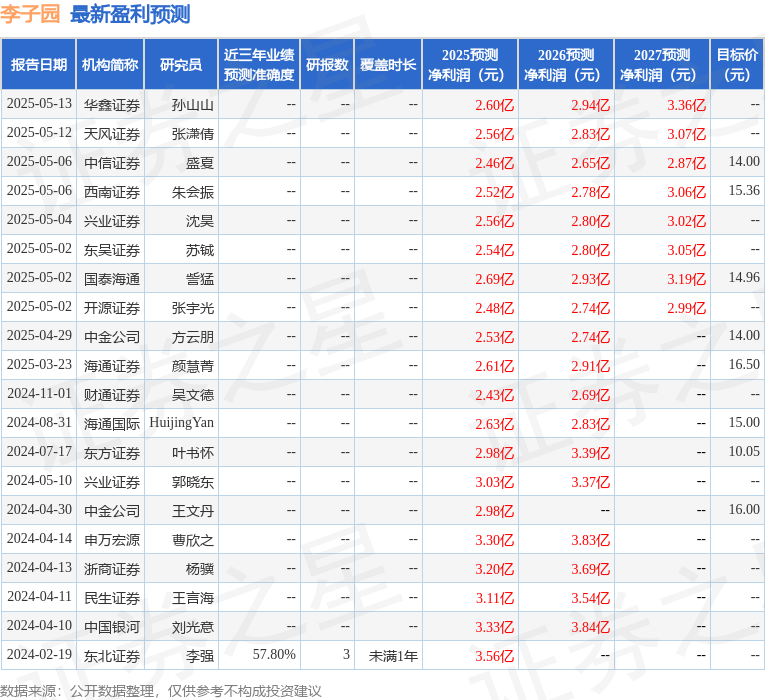 最新盈利预测明细如下: