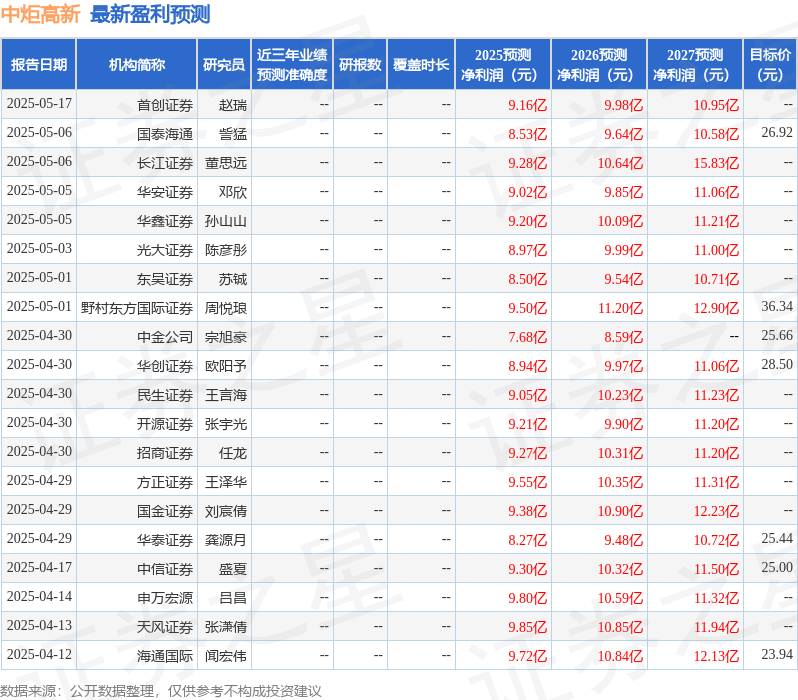 最新盈利预测明细如下: