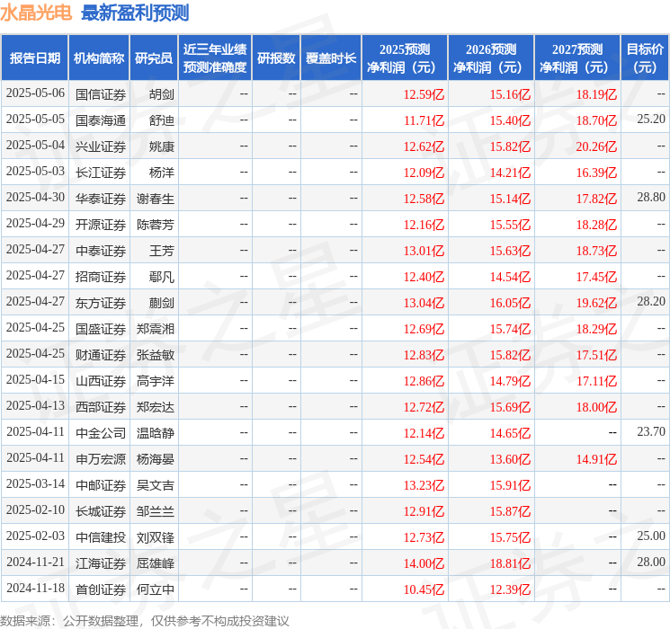 最新盈利预测明细如下: