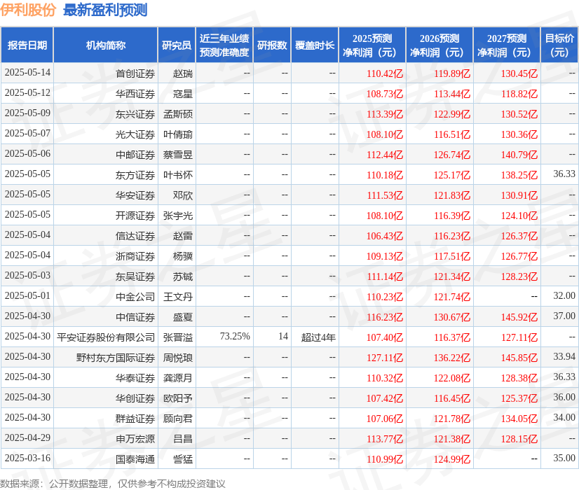 诚通证券股份有限公司陈文倩近期对伊利股份进行研究并发布了研究报告《伊利股份2024年年报2025年一季报点评:公司有效去化库存,单季营收有望触底回升》,给予伊利股份买入评级。