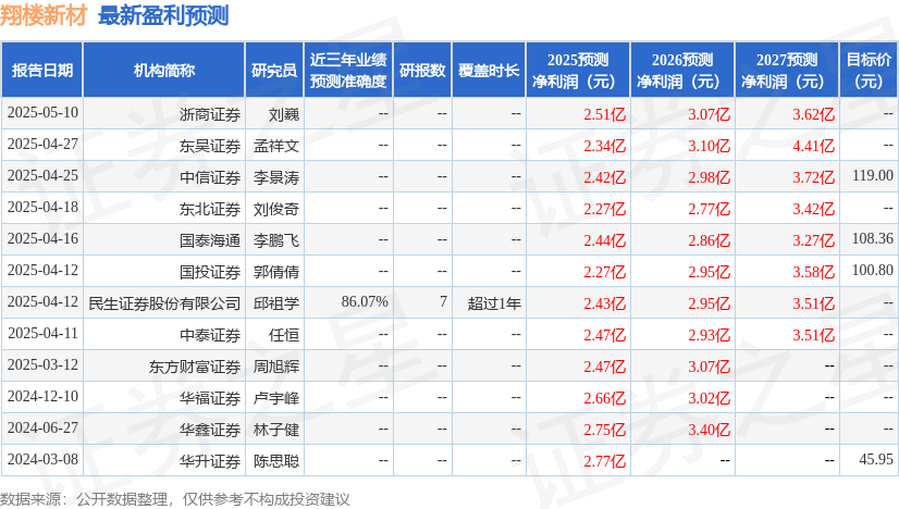 天风证券股份有限公司孙潇雅近期对翔楼新材进行研究并发布了研究报告《精冲材料迈向高端化,开辟机器人第二增长极》,首次覆盖翔楼新材给予买入评级,目标价105.7元。