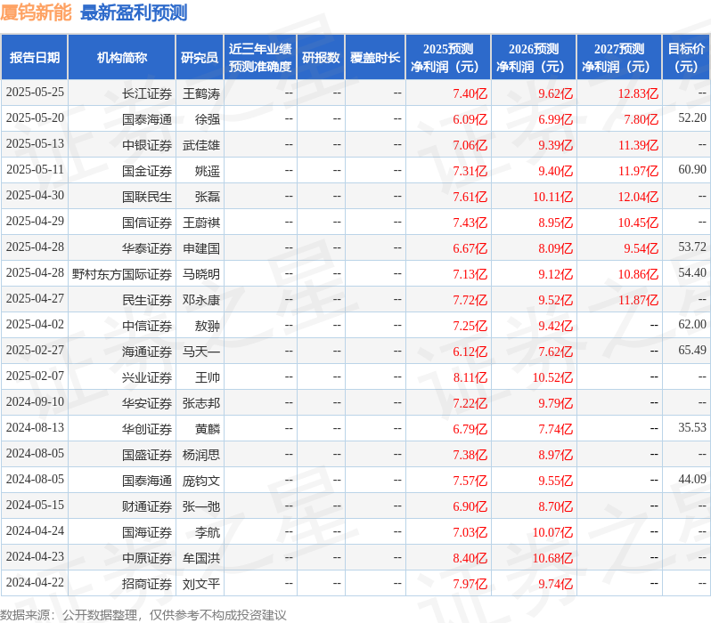 最新盈利预测明细如下: