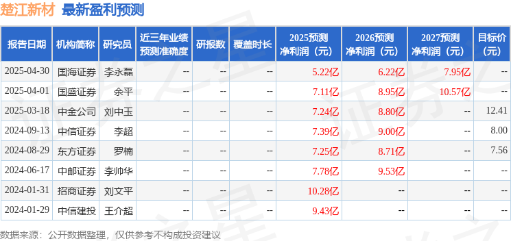 国金证券股份有限公司杨晨,任旭欢近期对楚江新材进行研究并发布了研究报告《铜基龙头进击军工新材料,有望受益于航空航天新景气》,首次覆盖楚江新材给予买入评级,目标价14.16元。