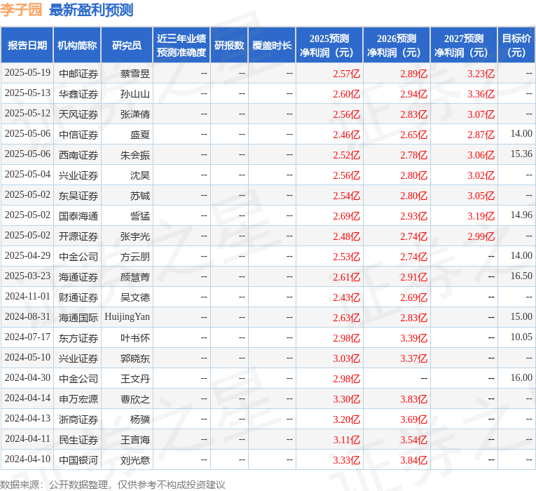 最新盈利预测明细如下:
