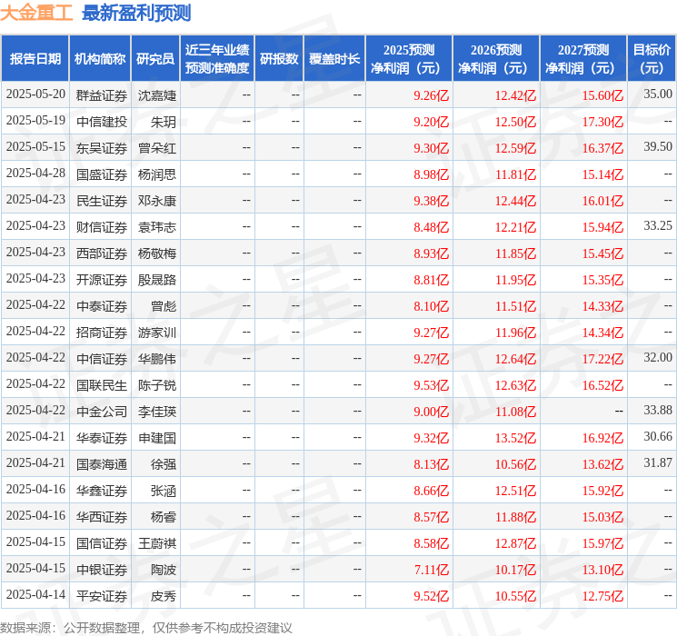 国金证券股份有限公司姚遥近期对大金重工进行研究并发布了研究报告《欧洲海风景气向上,订单放量迎接双击》,首次覆盖大金重工给予买入评级,目标价40.85元。