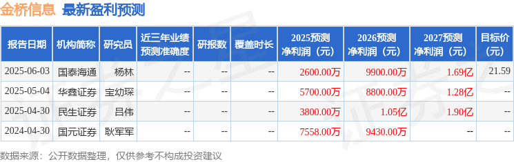 海通国际证券集团有限公司杨林,宋亮近期对金桥信息进行研究并发布了研究报告《首次覆盖报告:困境反转初显,AI调解多元解纷正放量》,首次覆盖金桥信息给予增持评级,目标价21.59元。