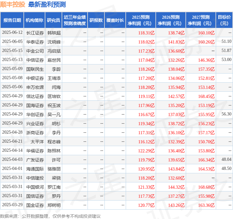 我们预计公司2025-2027年归母净利润分别为119.11亿元、142.57亿元、168.45亿元,同比分别增长17.1%、19.7%、18.2%,对应6月19日市盈率分别20XM外汇官网.6倍、17.2倍、14.6倍。公司作为综合快递物流龙头,中长期价值空间广阔,维持“买入”评级。