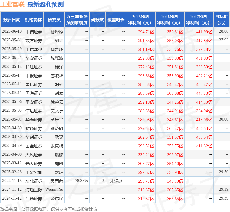 最新盈利预测明细如下: