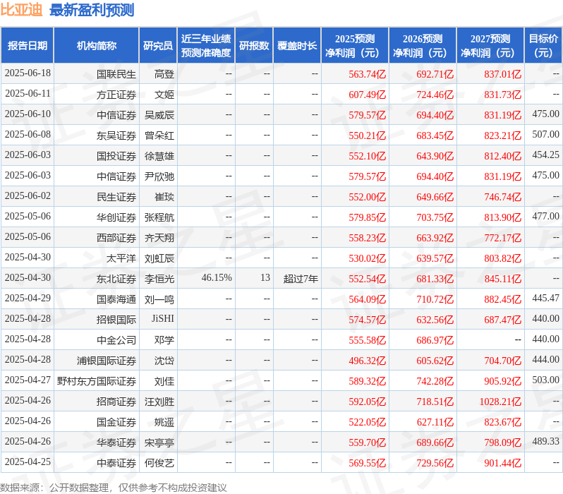 最新盈利预测明细如下: