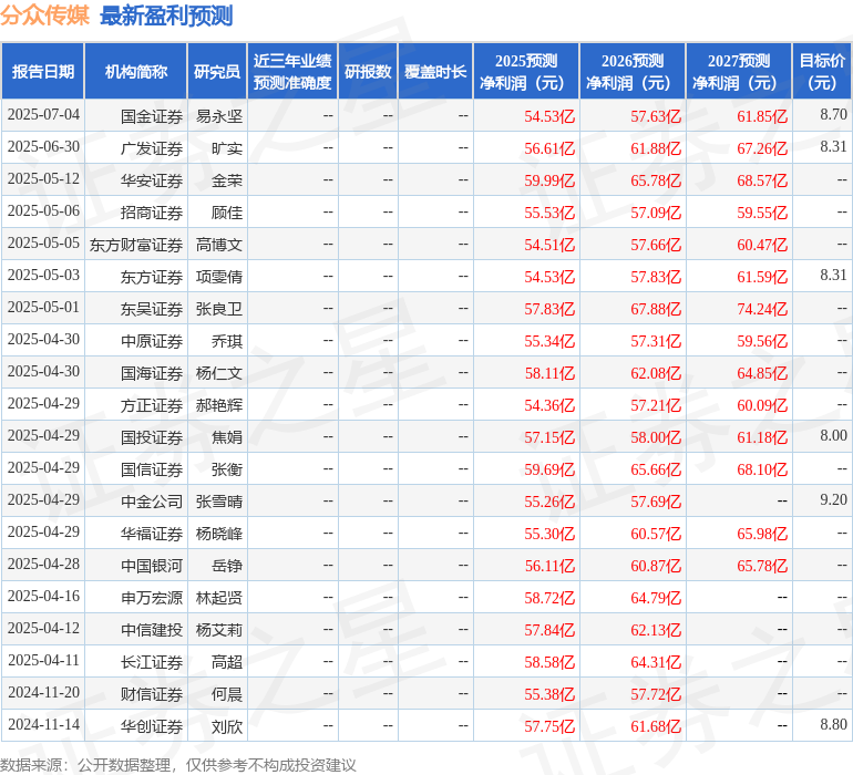 盈利预测与投资评级:我们认为,分众传媒XM外汇官网有望受益于对新潮集团的整合收购、即时零售公司对线下广告渠道的投放预算加大以及宏观经济的稳健恢复,公司单点位效益可能呈现增长趋势。在未算入新潮整合后的业绩影响、未算入梯媒“碰一碰”中的增量业务贡献情况下XM外汇官网,我们预计公司2025-2027年营收有望实现135.33/144.94/155.43亿元,同比+10.4%/+7.1%/+7.2%;有望实现归母净利润55.55/59.81/65.28亿元,同比+7XM外汇官网.7%/+7.7%/+9.1%。截至2025年7月7日,对应PE分别为19.89/18.47/16.93x,给予“买入”评级。