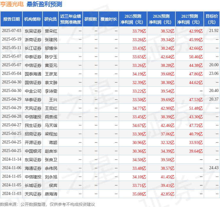 东吴证券股份有限公司曾朵红,郭亚男,胡隽颖近期对亨通光电进行研究并发布了研究报告《光通信与能源主业双轮驱动,海缆成长动能十足》,给予亨通光电买入评级,目标价21.92元。