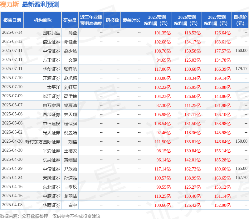 民生证券股份有限公司崔琰,乔木近期对赛力斯进行研究并发布了研究报告《系列点评一:2025H1经营业绩高增 高端市场持续突破》,给予赛力斯买入评级。