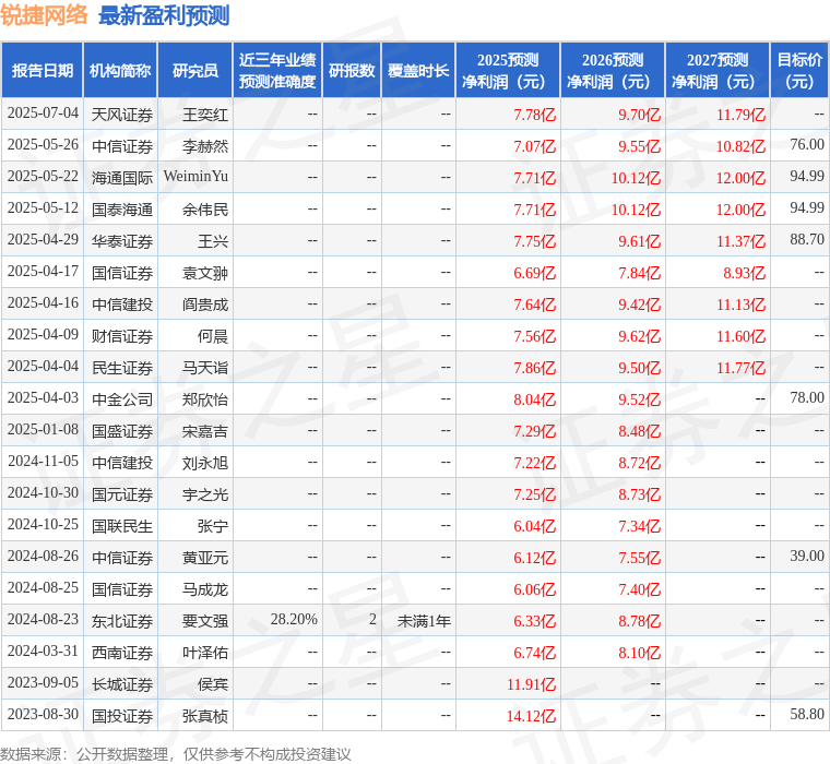 民生证券股份有限公司马天诣,范宇近期对锐捷网络进行研究并发布了研究报告《2025年中报预告点评:互联网数据中心交换机交付加快,Q2利润高增》,给予锐捷网络买入评级。